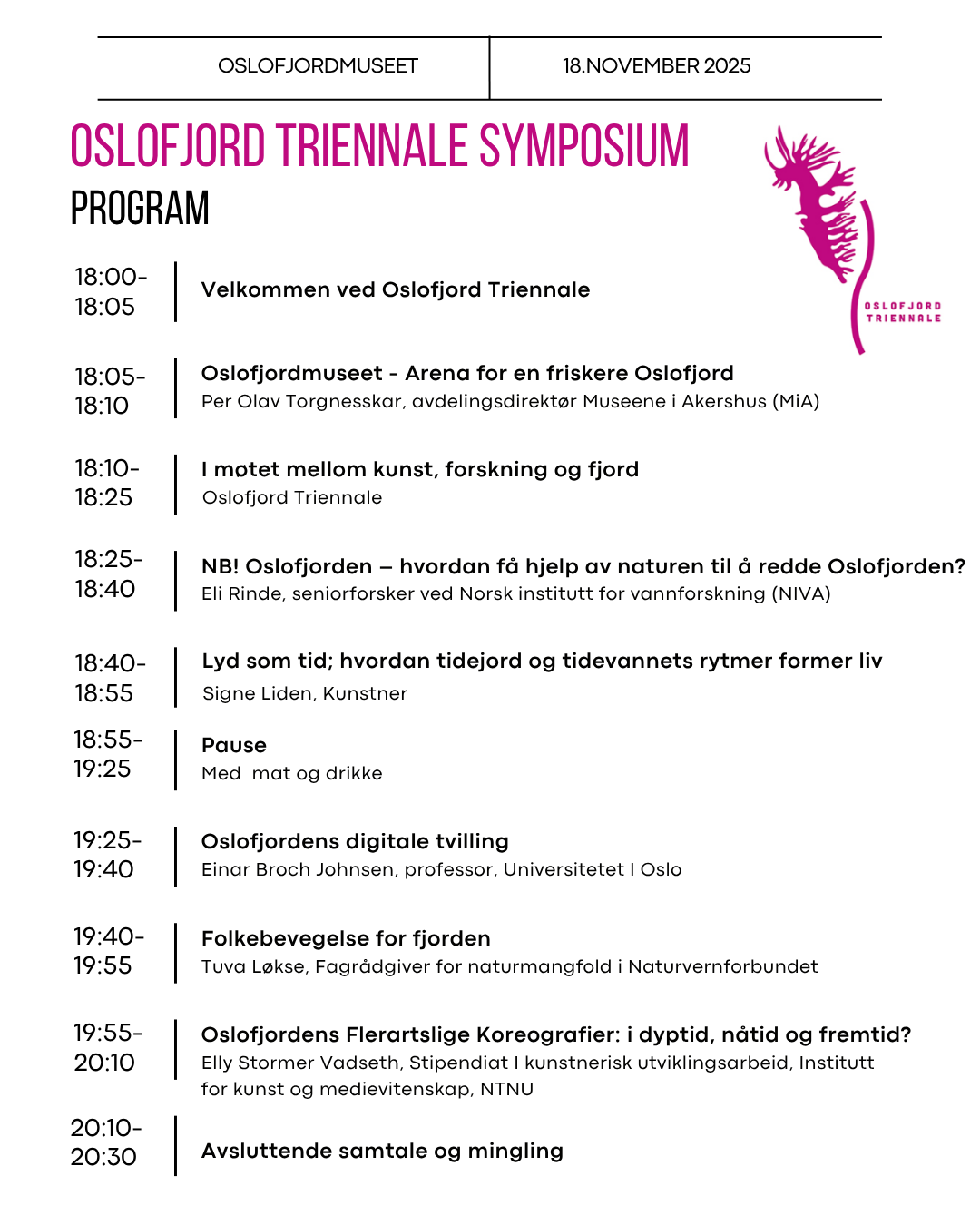 Under Oslofjord Triennale Symposium åpner vi dørene til fjorden som nabolag; hvem som bor under overflaten, og hvem som migrerer hit. Vi samles for å stille spørsmålene: Hvem er fjorden, og kan vi lære den å kjenne som et juridisk subjekt for en bedre relasjon i tiden fremover?